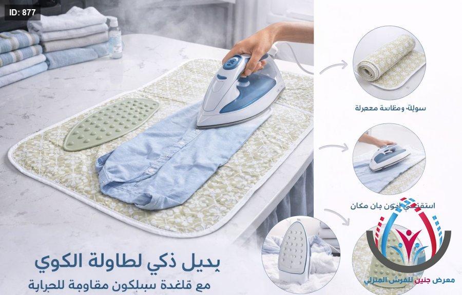 1️⃣ افردي مفرش الكوي على أي سطح مستوٍ.